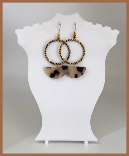 2 inches in length gold hoop earrings with half circle brown and cream disk