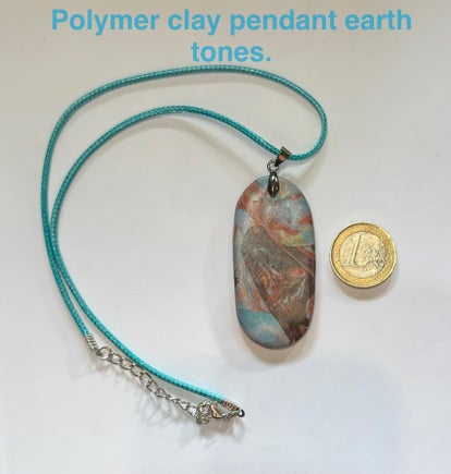 A mixed colour of earth tones the oblong pendant measures 2.5 inches length and 1.2 inches width. Waxed turquoise leather cord 16 to 18 inches.