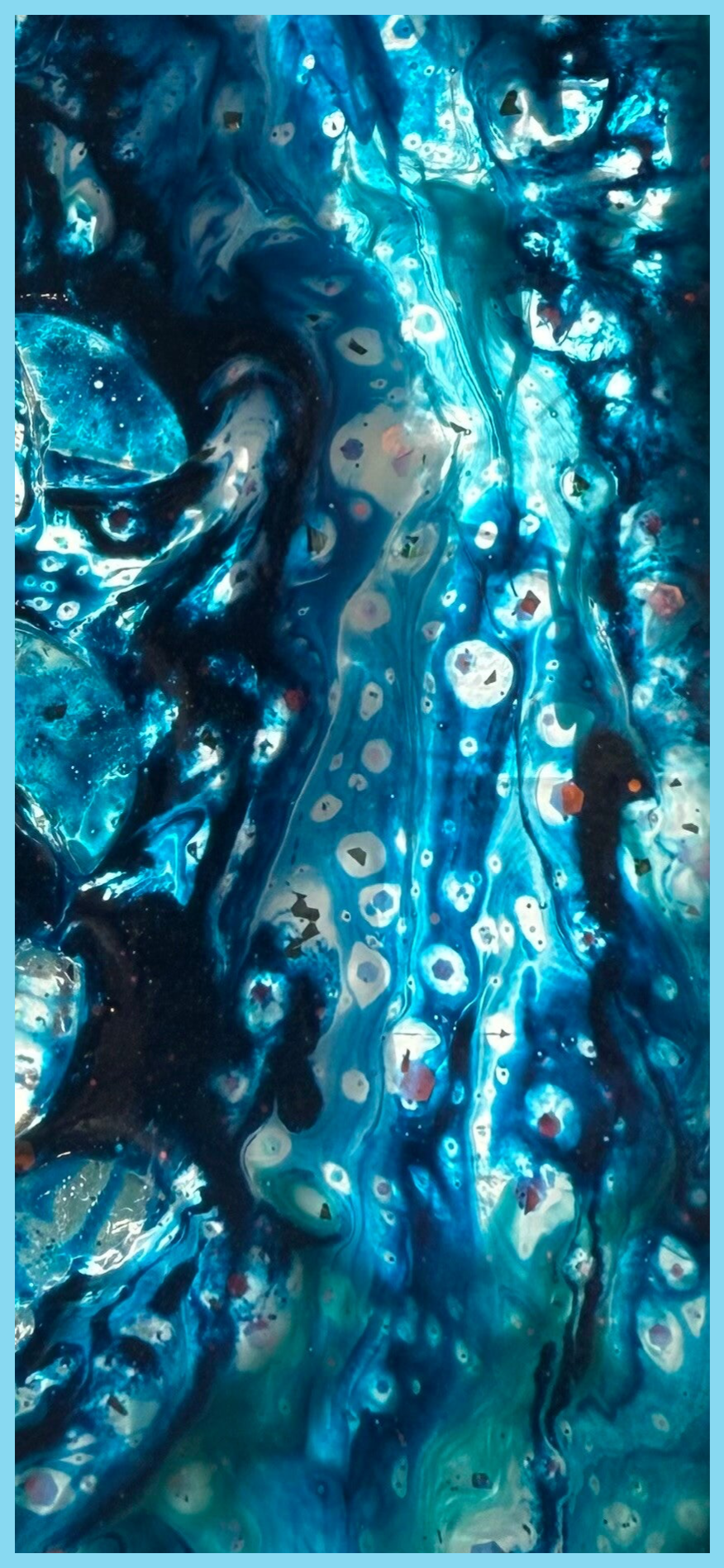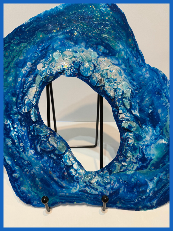 Made with resin the centre is crackled white glass pebbles. Roughly 30cm by 25cm. Comes with black wrought iron display stand.