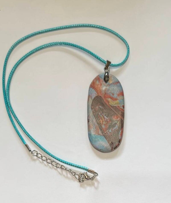 A mixed colour of earth tones the oblong pendant measures 2.5 inches length and 1.2 inches width. Waxed turquoise leather cord 16 to 18 inches.