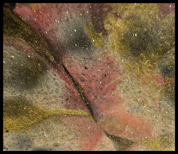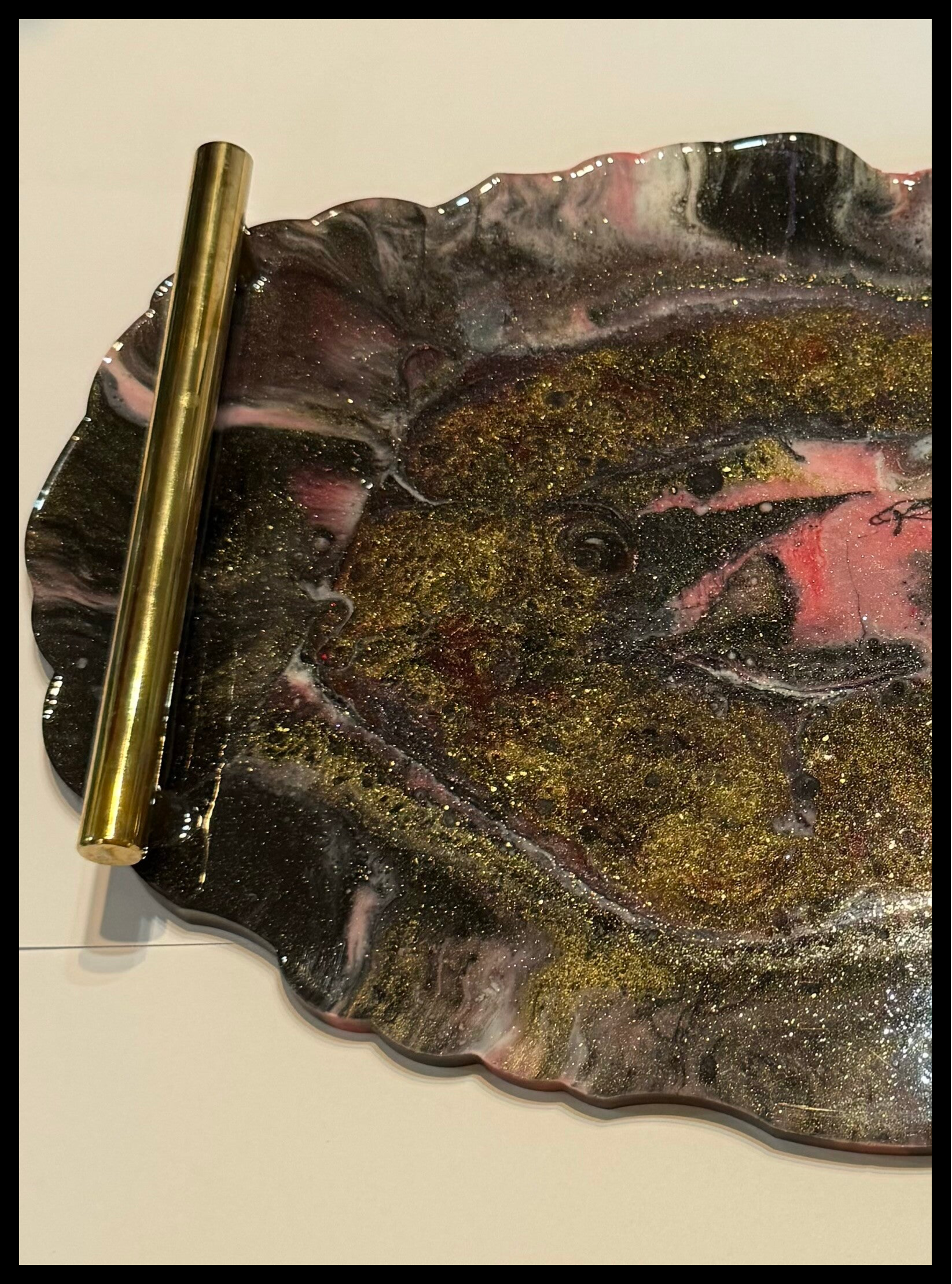 Made with resin this gold, black, purple and white irregular shaped tray with gold handles measures L 33.2cm W 22.5cm