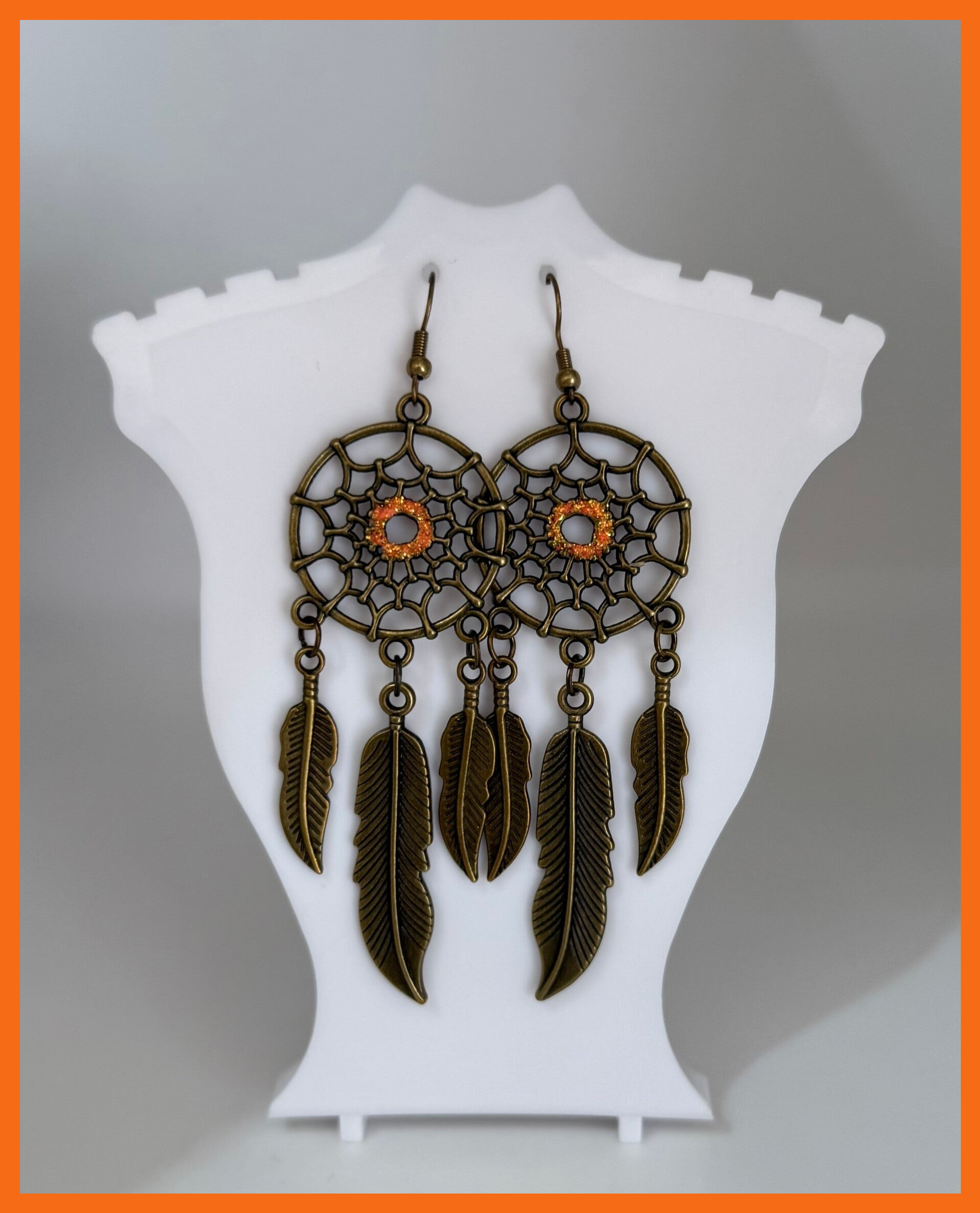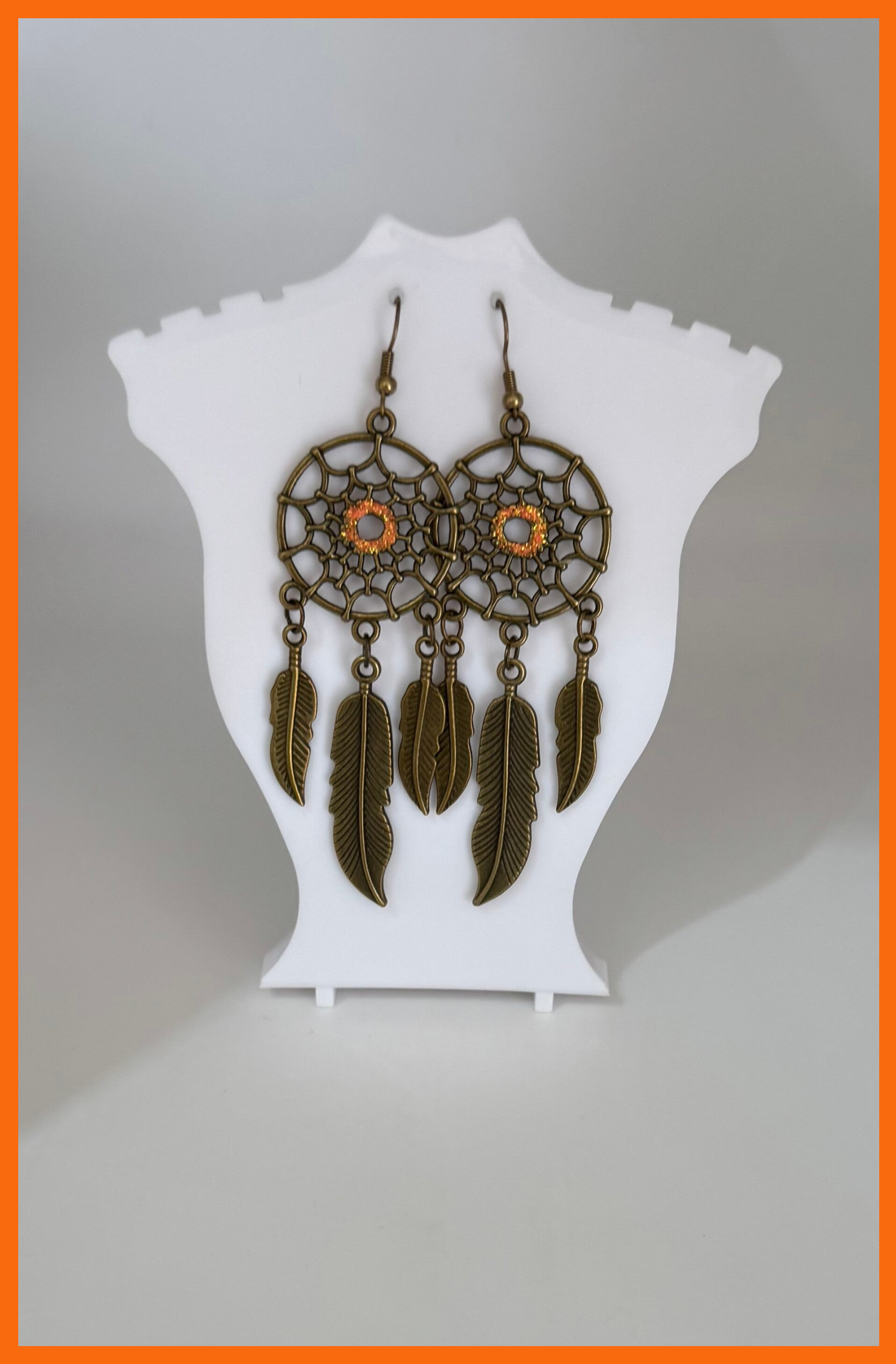 Orange sparkly centre bohemian style earrings with dangling feathers