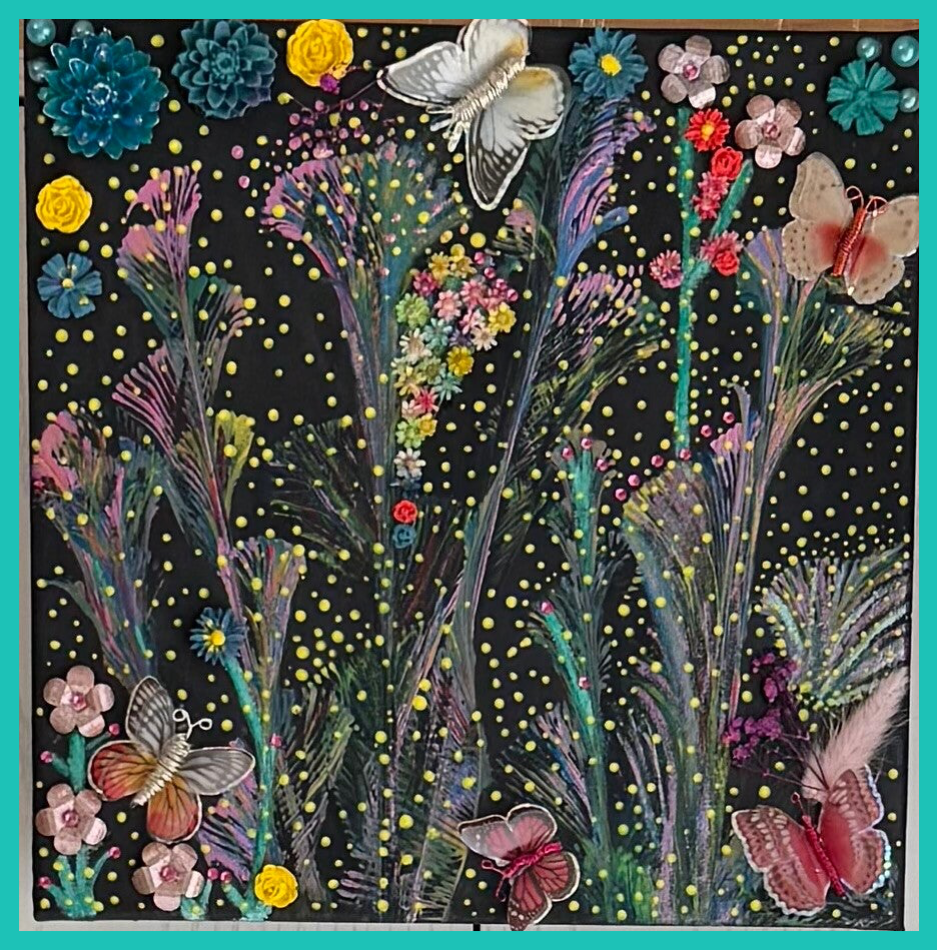 Mixed media canvas 12 by 12 inch. There is lots to look at and would brighten any room