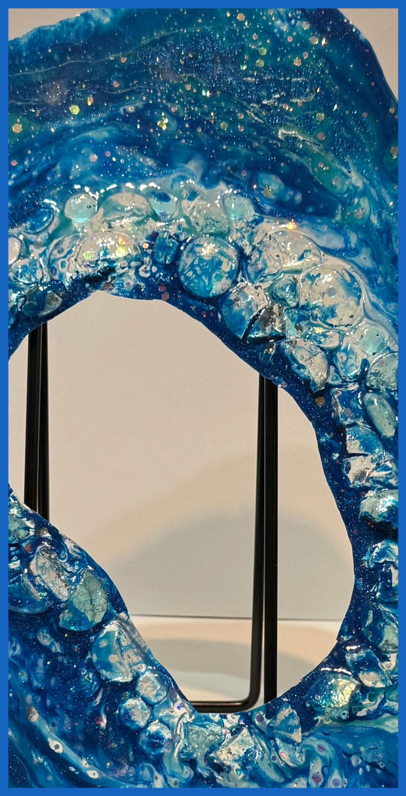 Made with resin the centre is crackled white glass pebbles. Roughly 30cm by 25cm. Comes with black wrought iron display stand.