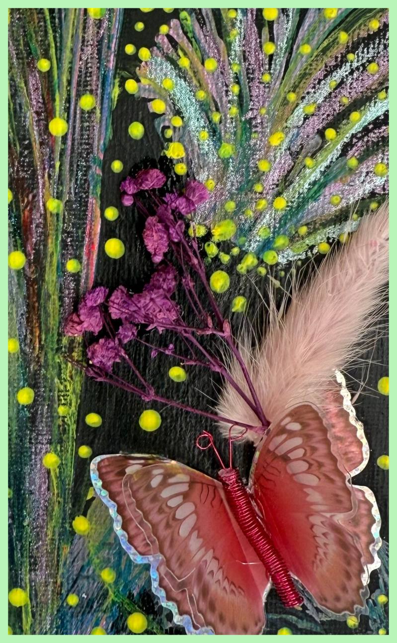 Mixed media canvas 12 by 12 inch. There is lots to look at and would brighten any room