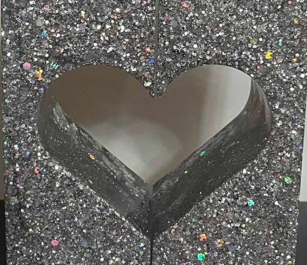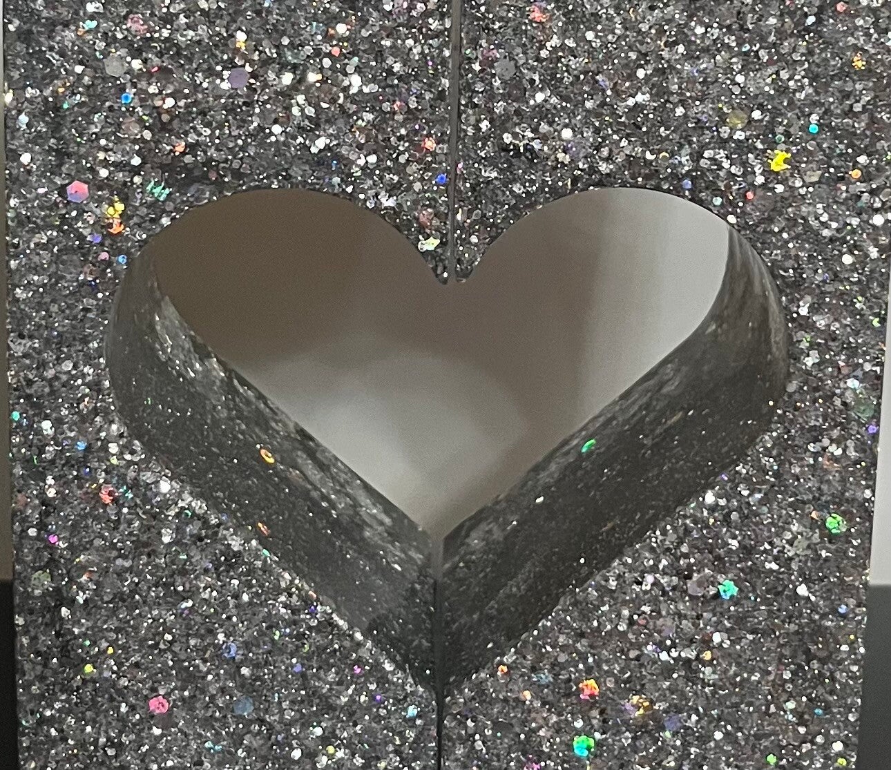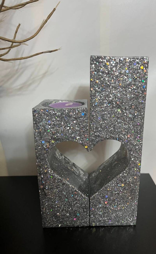 2 tall silver glitter and silver foil tealight holders. When placed together create a love heart centre. Comes with 2 lilac tealights