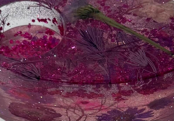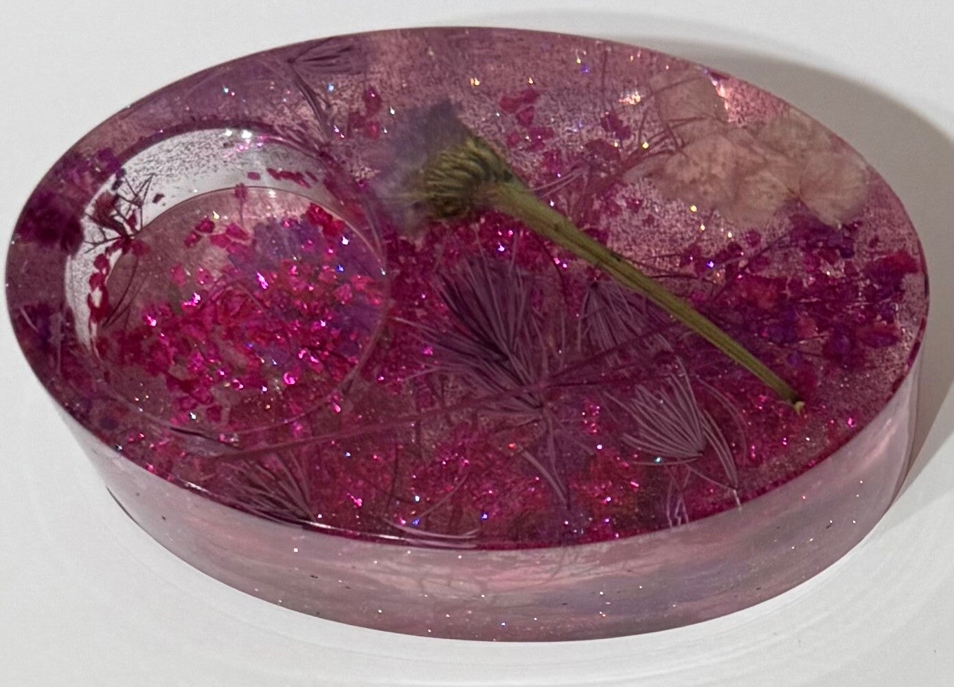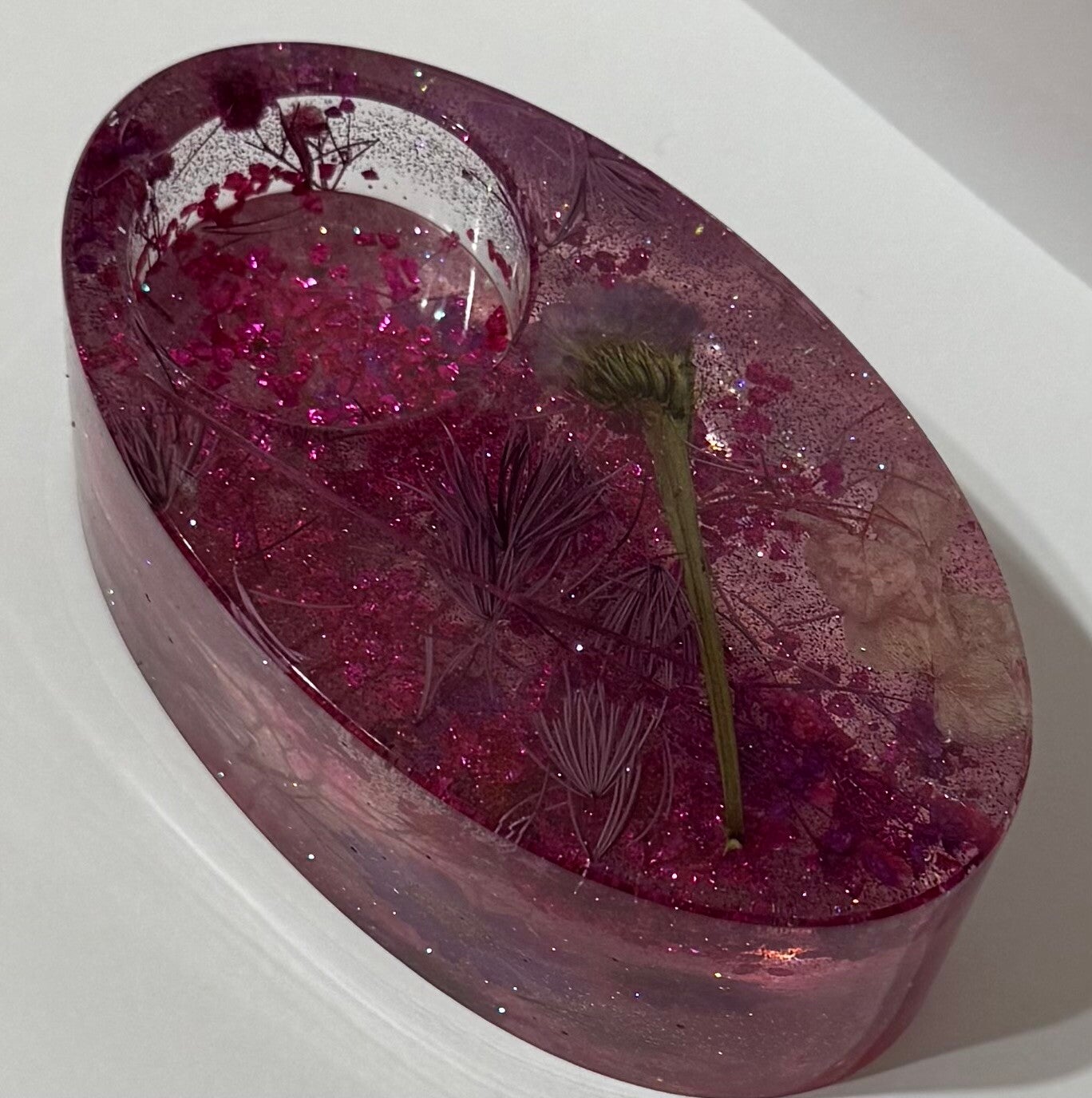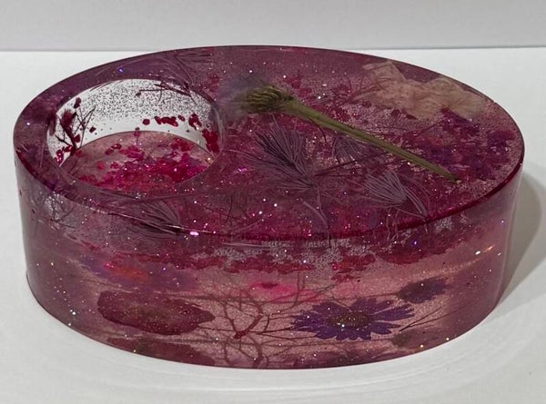 Oval tealight holder pinks and purples set with glitter and dried flowers