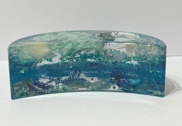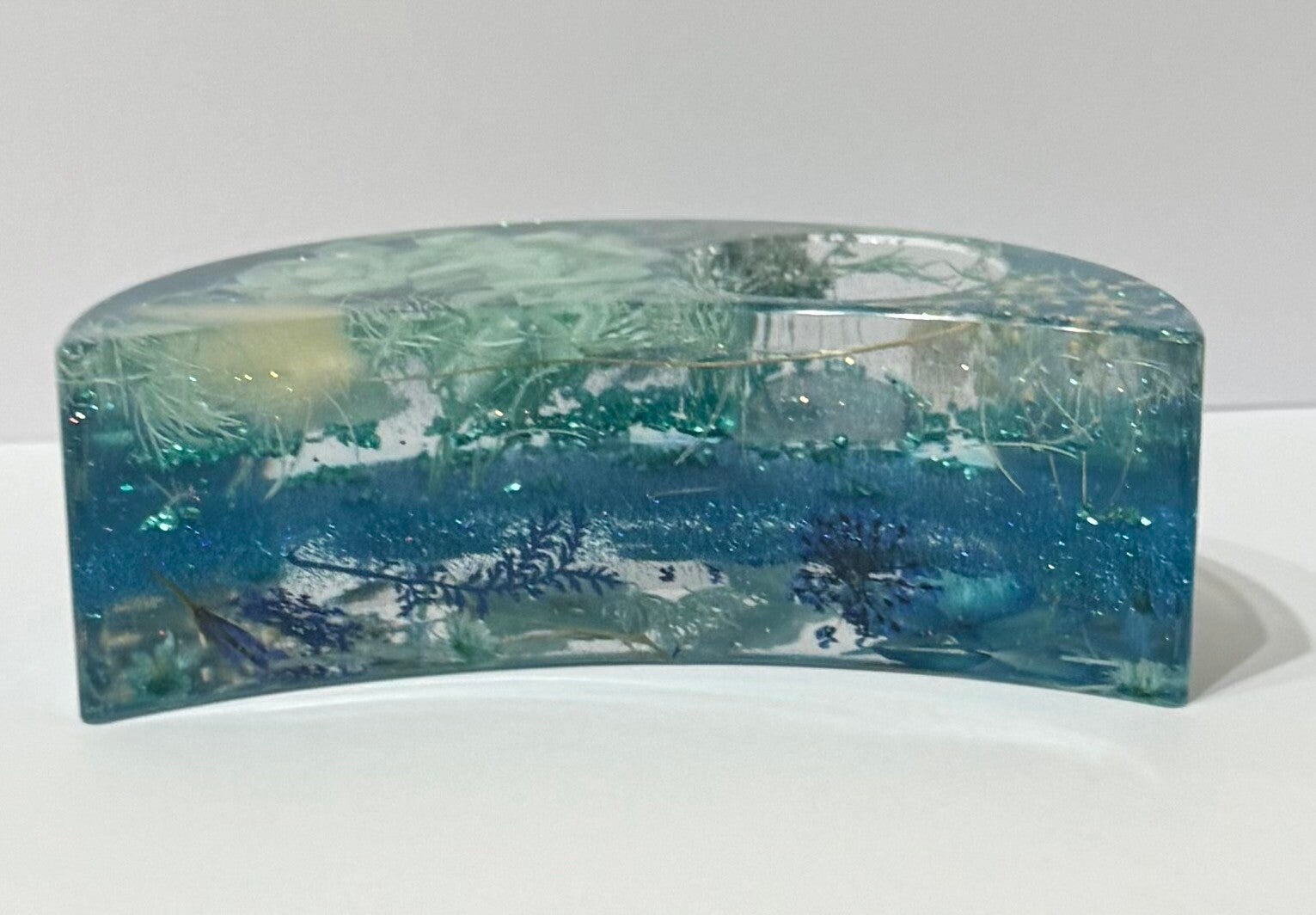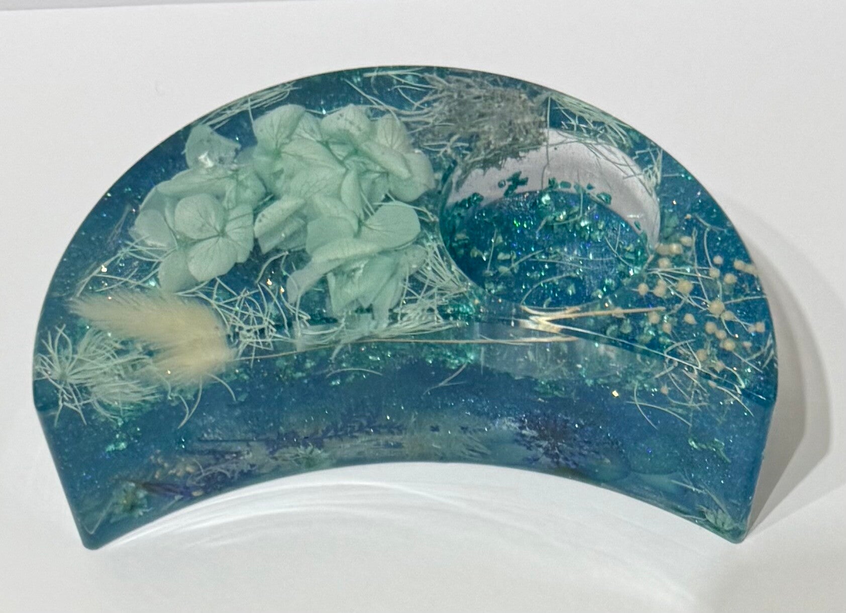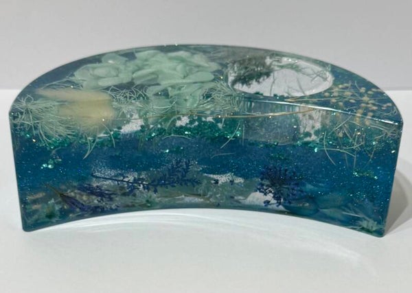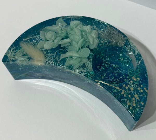 Resin tealight holder half moon shape set with blue and turquoise flowers and glitter