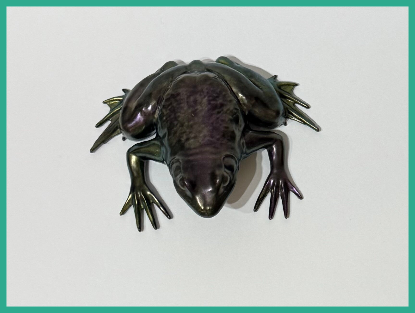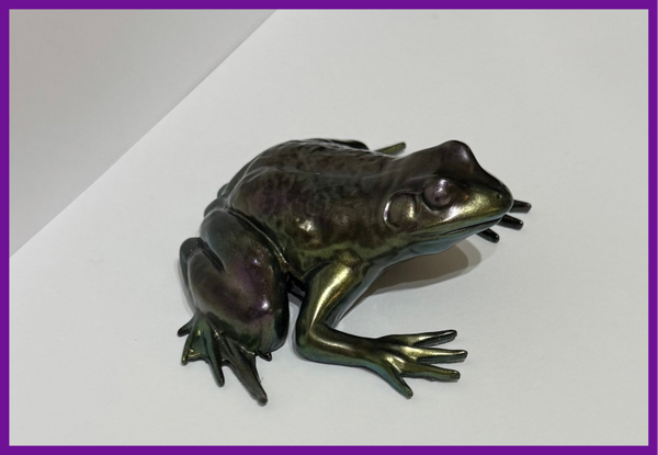 Can be displayed inside or out full resin frog shimmery green and purple.