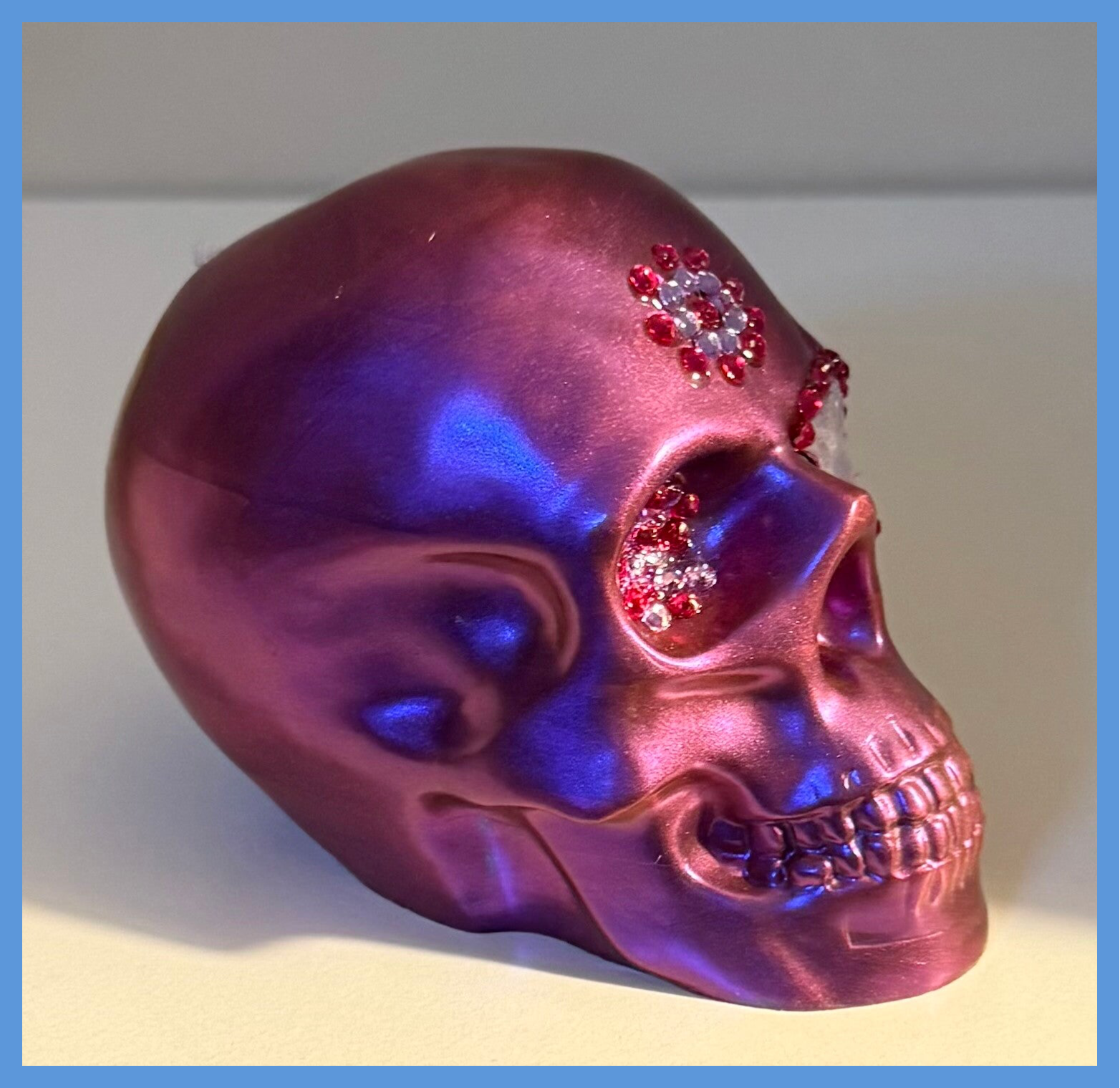 Shimmery purple and blue full resin skull medium size. Height roughly 8cm width 6.5cm length 9.5cm